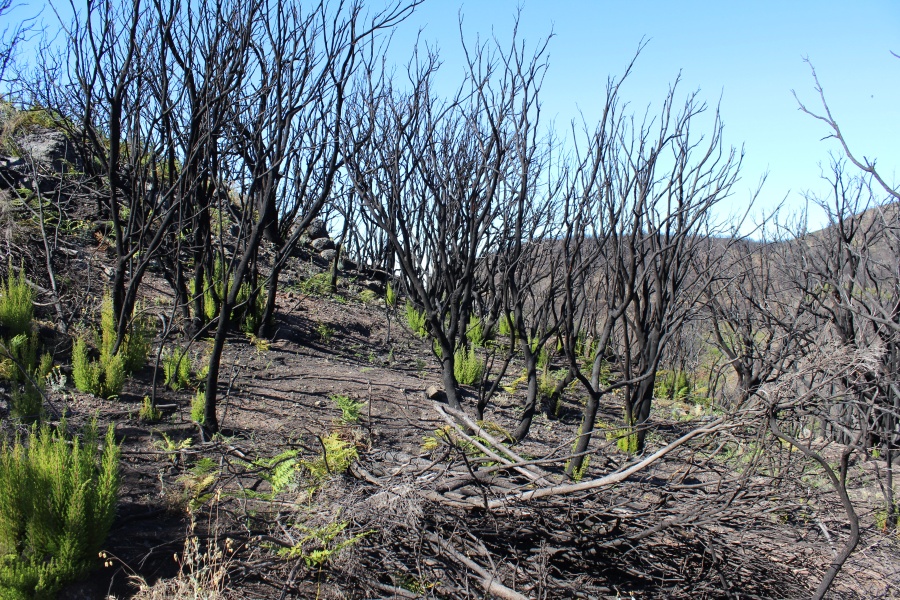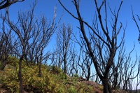 Strahlendes Blau hinter verkohltem Holz der Baumheide